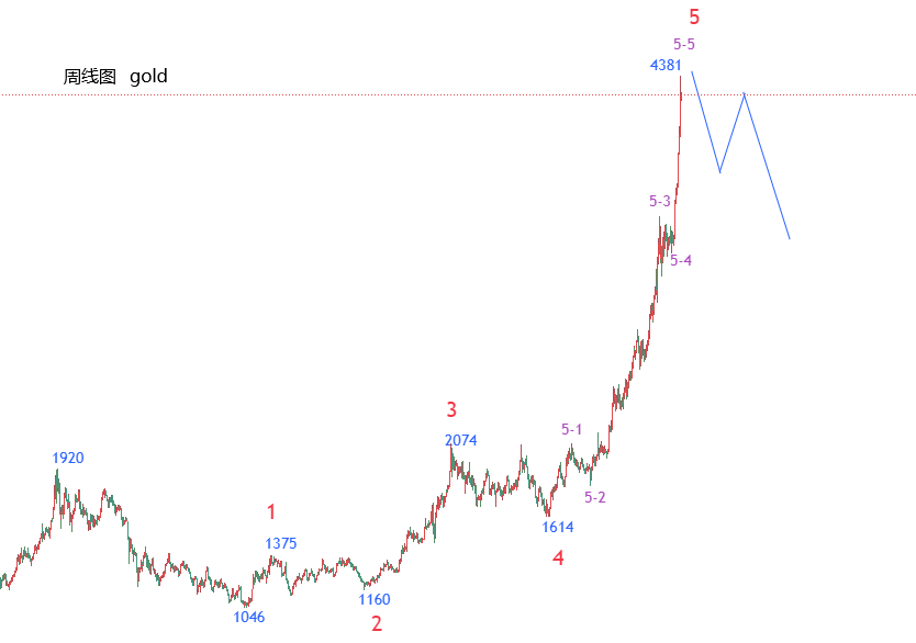 波浪结构分析:周线图来看,上周黄金冲高4381大幅下跌至4004,我们判定黄金1046向上五波推动完成,如下图,1046-1375为一浪,1375-1160为二浪,1160-2074为三浪,2074-1614为四浪,1614-4381为五浪,五浪为延长浪,五浪内部目前大小级别结构已全部走完,后市黄金整体以4381为防守向下看调整。同级别对应1920-1046波段。也就是说,黄金接下来可能会进入慢长的调整走势。